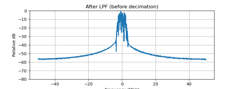 plot_spectrum(rx_filt, fs, "After LPF (before decimation)")