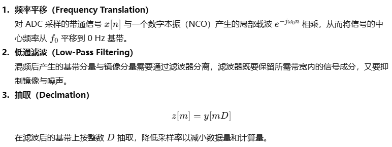 现代雷达数字接收机中,高速 ADC 对射频(RF)或中频(IF)信号进行采样后,下一步的数字处理通常要求将该高频带的信号移动到基带,并进一步降低数据率,以便在随后的算法(如脉冲压缩、FFT 多普勒分析、目标检测与估计)中获得更高的效率与精度。数字下变频(DDC)正是实现这一目标的数字信号处理模块。DDC 将 ADC 采样的带通信号转换为复数基带信号,并降低采样率,同时保留信号的全部信息(幅度与相位),从而简化后续处理工作。
