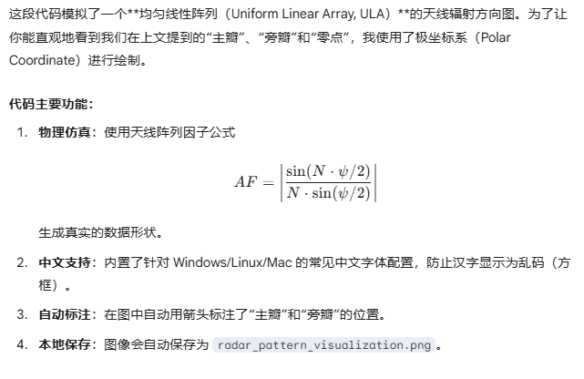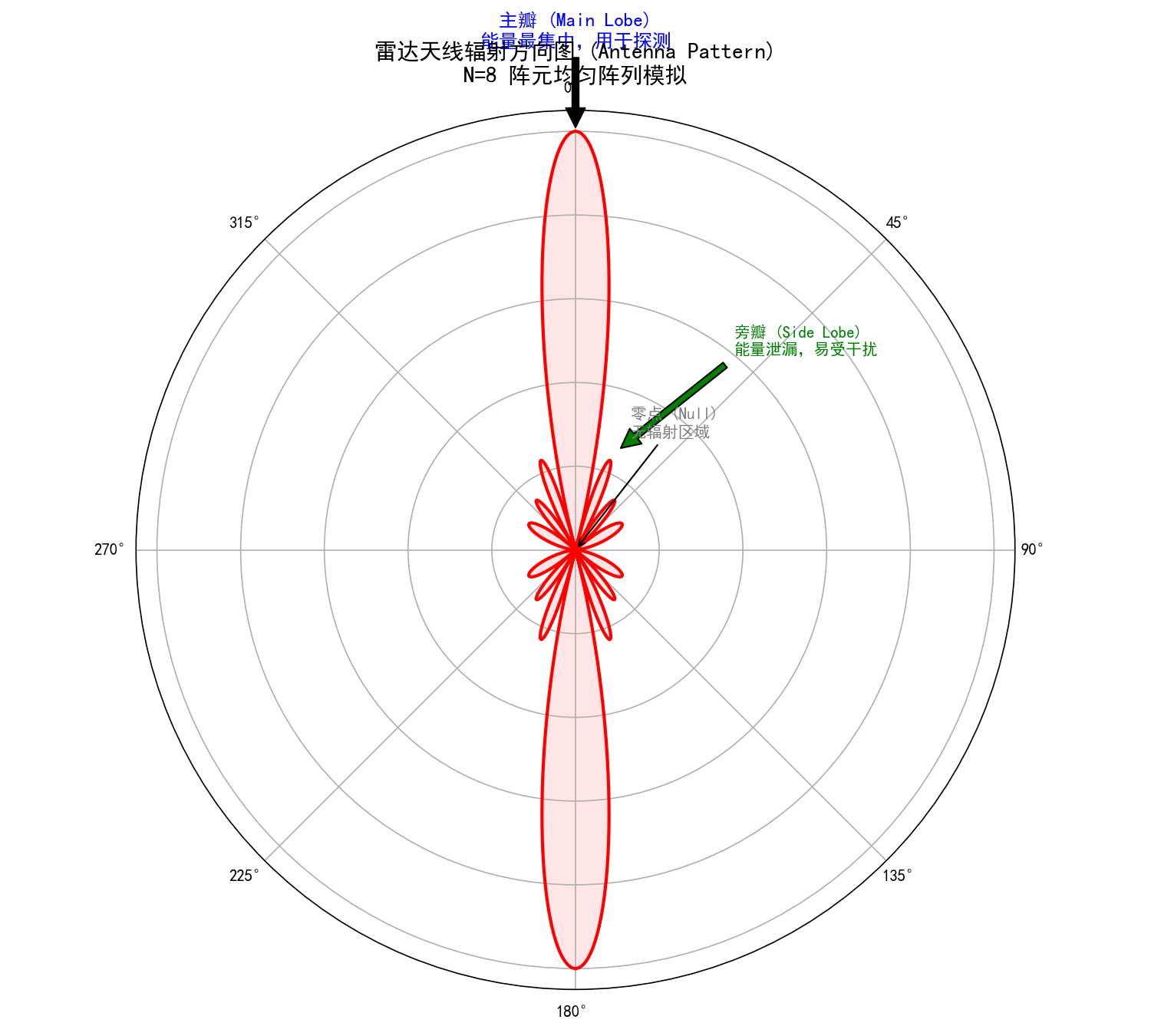 零点 (Nulls):辐射极弱甚至为零的方向,用于隔离干扰信号。