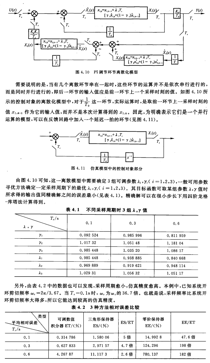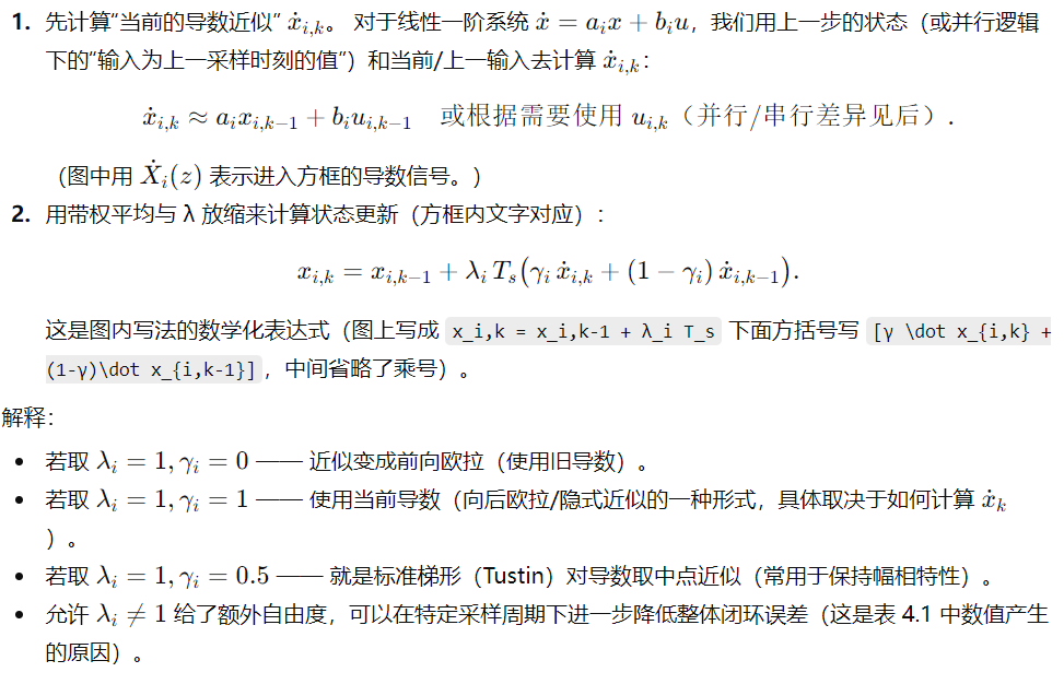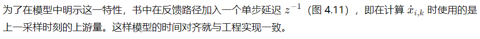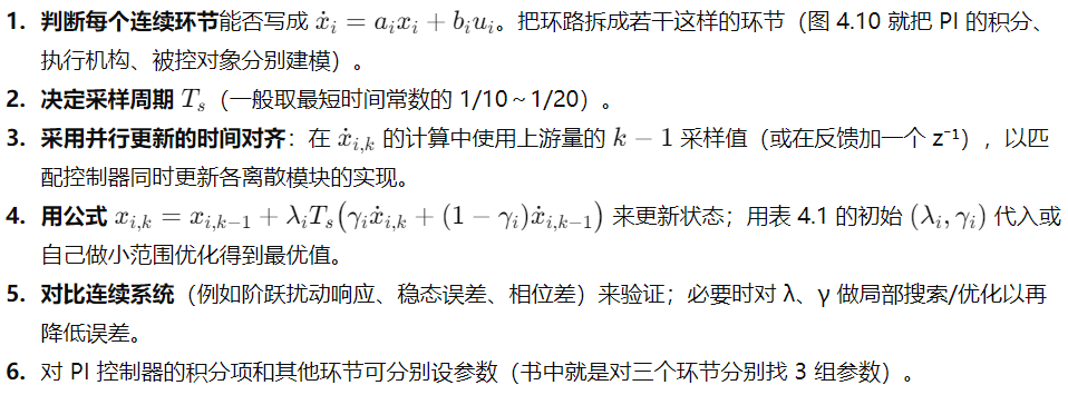 书上强调的一点:当环路中有若干个离散块“串联”时,如果在一次采样周期里把它们依次顺序更新,得到的结果与实际可在微控制器/数值仿真中“同时计算所有离散块、并把前一采样周期的输出作为输入” 的情况不同。工程实现常常是“在时刻 k,同时用上一次(时刻 k-1)的信号作为每个子环节的输入来计算这些子环节的 k 时刻新值”,因此后一个环节在实际运算中看到的是前一个环节在 k−1 时刻的输出,而不是刚刚计算出来的 k 时刻输出——这就产生了并行更新的模型差异。