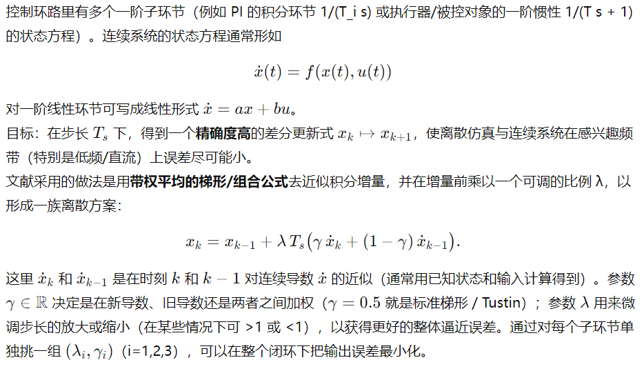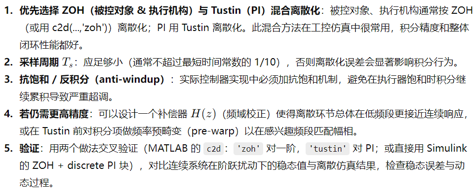 3) PI 控制器用 Tustin(双线性)离散化(保留积分精度)