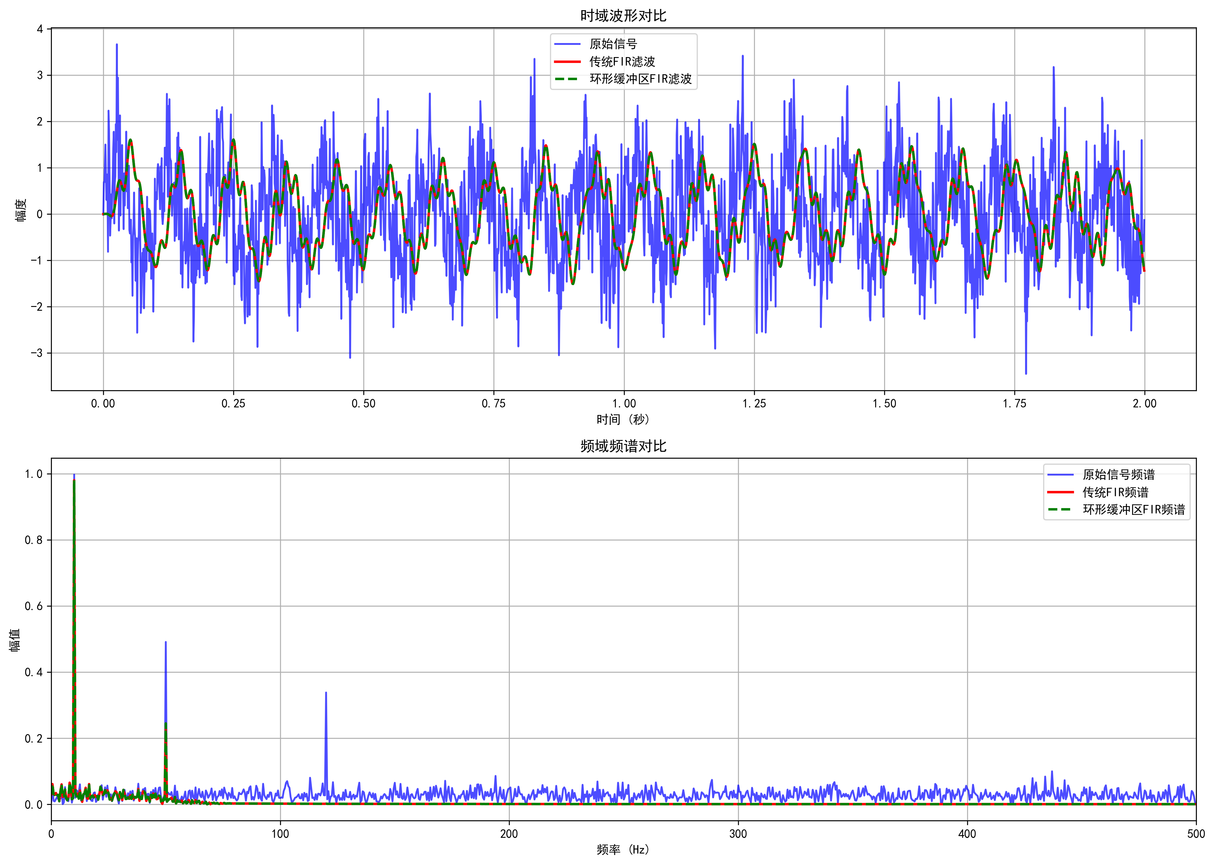 本脚本演示如何设计FIR滤波器,将其应用于含噪声的信号,并通过多种可视化方式