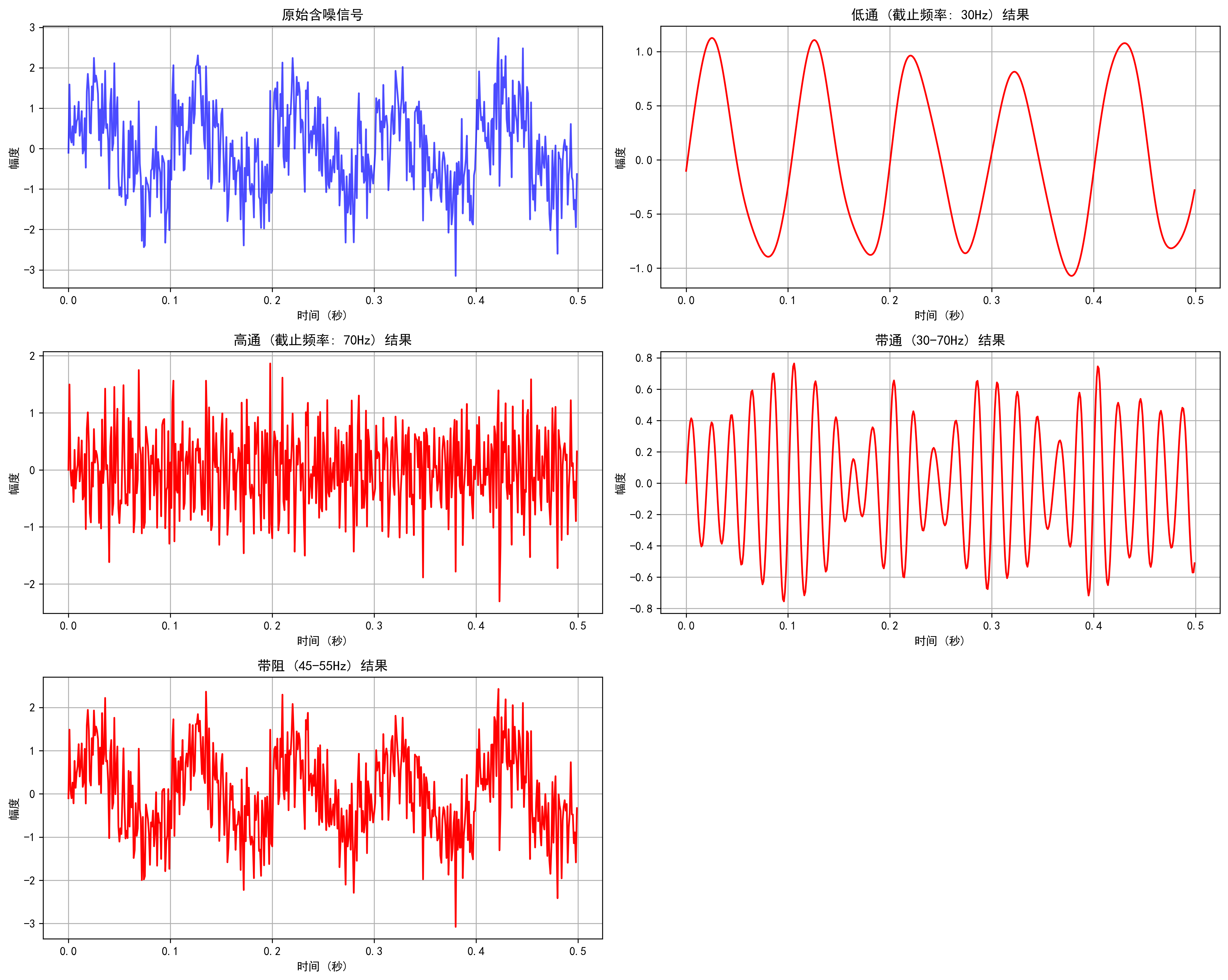 raise ValueError("不支持的滤波器类型。请选择 'lowpass', 'highpass', 'bandpass' 或 'bandstop'")