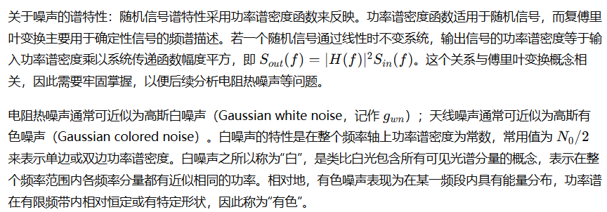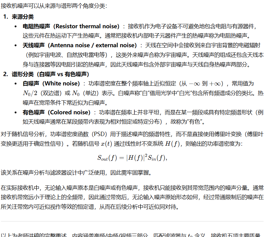 在实际接收机中,无论是白噪声还是有色噪声,接收机只能接收到通过其带宽范围内的噪声分量。通常接收机带宽远小于理论上的全频带白噪声范围,因此通过带宽后,无论输入噪声原始是白噪声还是有色噪声,经过接收机带宽限制后的谱形可在近似意义上视为相似,从而在后续处理时可以等同对待。以上概念需先理解,为后续噪声系数与灵敏度的推导打基础。