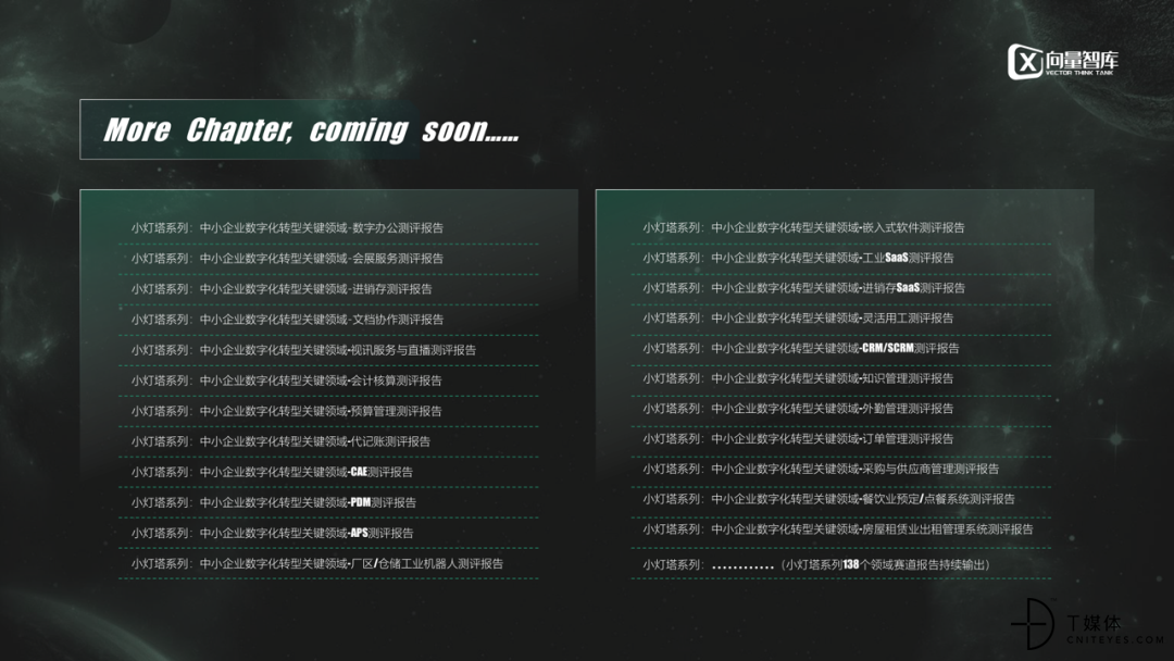 向量智库发布了超过200份的系列报告,包括小灯塔、双碳、信创等,聚焦中小企业数字化转型、碳管理及信息技术创新等领域,提供市场规模、应用数据和品牌信息,助力企业和决策者把握市场动态和选择合适的技术解决方案。
