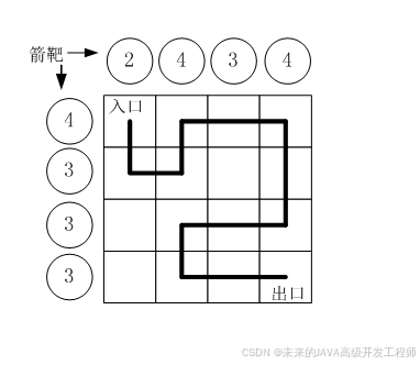 按习俗,骑士要从西北角走到东南角。可以横向或纵向移动,但不能斜着走,也不能跳跃。每走到一个新方格,就要向正北方和正西方各射一箭。(城堡的西墙和北墙内各有 nn 个靶子)同一个方格只允许经过一次。但不必走完所有的方格。如果只给出靶子上箭的数目,你能推断出骑士的行走路线吗?有时是可以的,比如上图中的例子。