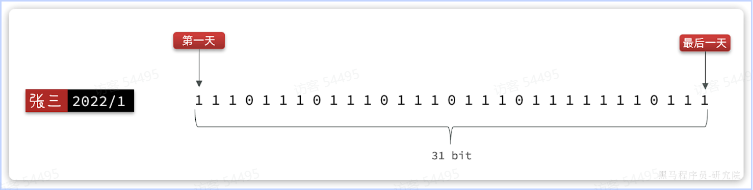 我们知道二进制是计算机底层最基础的存储方式了,其中的每一位数字就是计算机信息量的最小单位了,称之为bit,一个月最多也就 31 天,因此一个月的签到记录最多也就使用 31 bit 就能保存了,还不到 4 个字节。