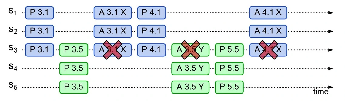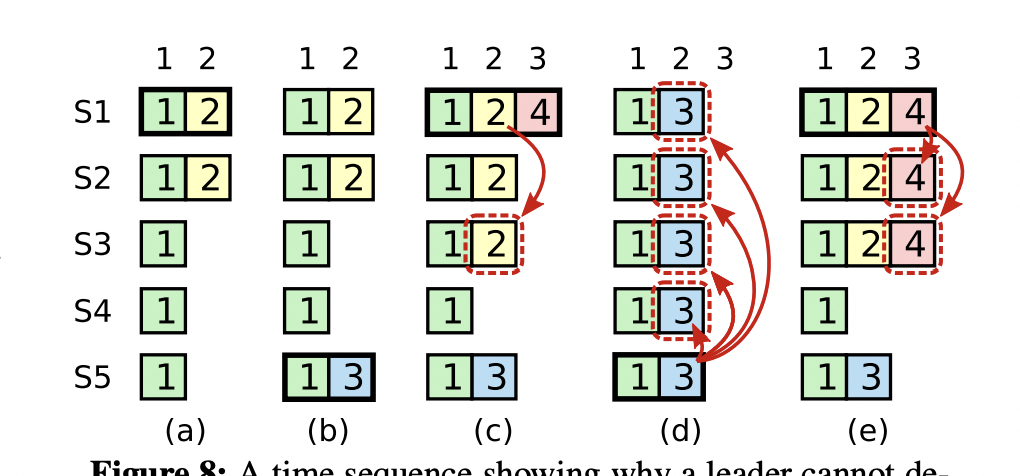 在图a的情况下S1作为Leader,如果在Term1中把数据2复制到S2就崩溃了(还没来得及commit),即图b的阶段,此时S5成为Candidate尝试发出RequestVote请求,由于其他节点都不“新”于S5,S5将会成为新的Leader,如图d所示写入数据5;如果S1在Term1中把数据2复制到大多数节点后commit再崩溃,此时S5发出RequestVote请求,根据前述限制,其将会竞选失败,因为其已提交的最后一条数据的Index皆小于S1-S3,只有S4会投票。