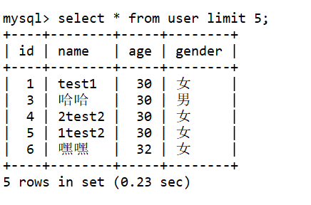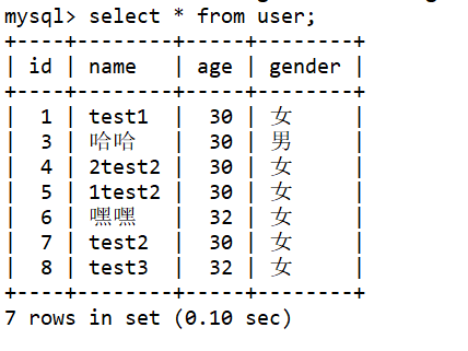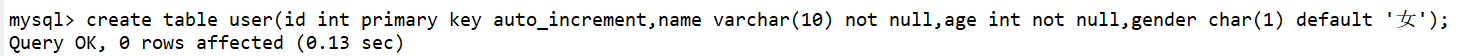 create table user(id int primary key auto_increment,name varchar(10) not null,age int not null,gender char(1) default '女');