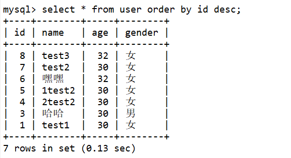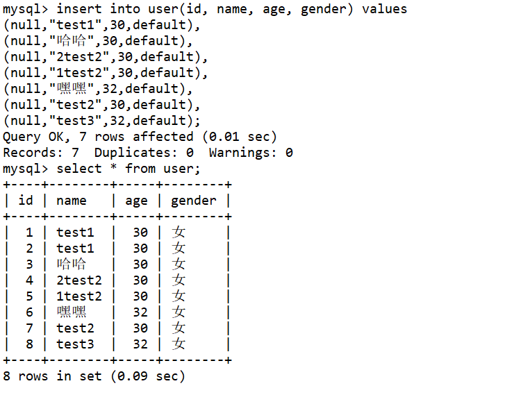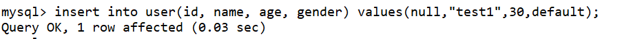 insert into user(id, name, age, gender) values(null,"test1",30,default);