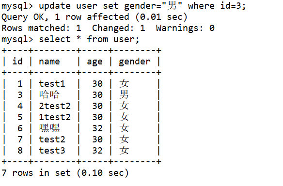 -- 将 user 表中 id 为3的数据中 gender 改为 男