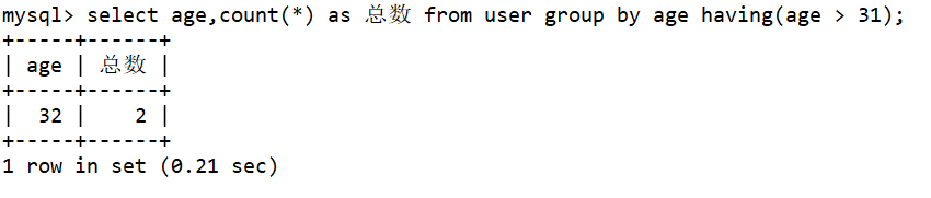 select age,count(*) as 总数 from user group by age having(age > 31);