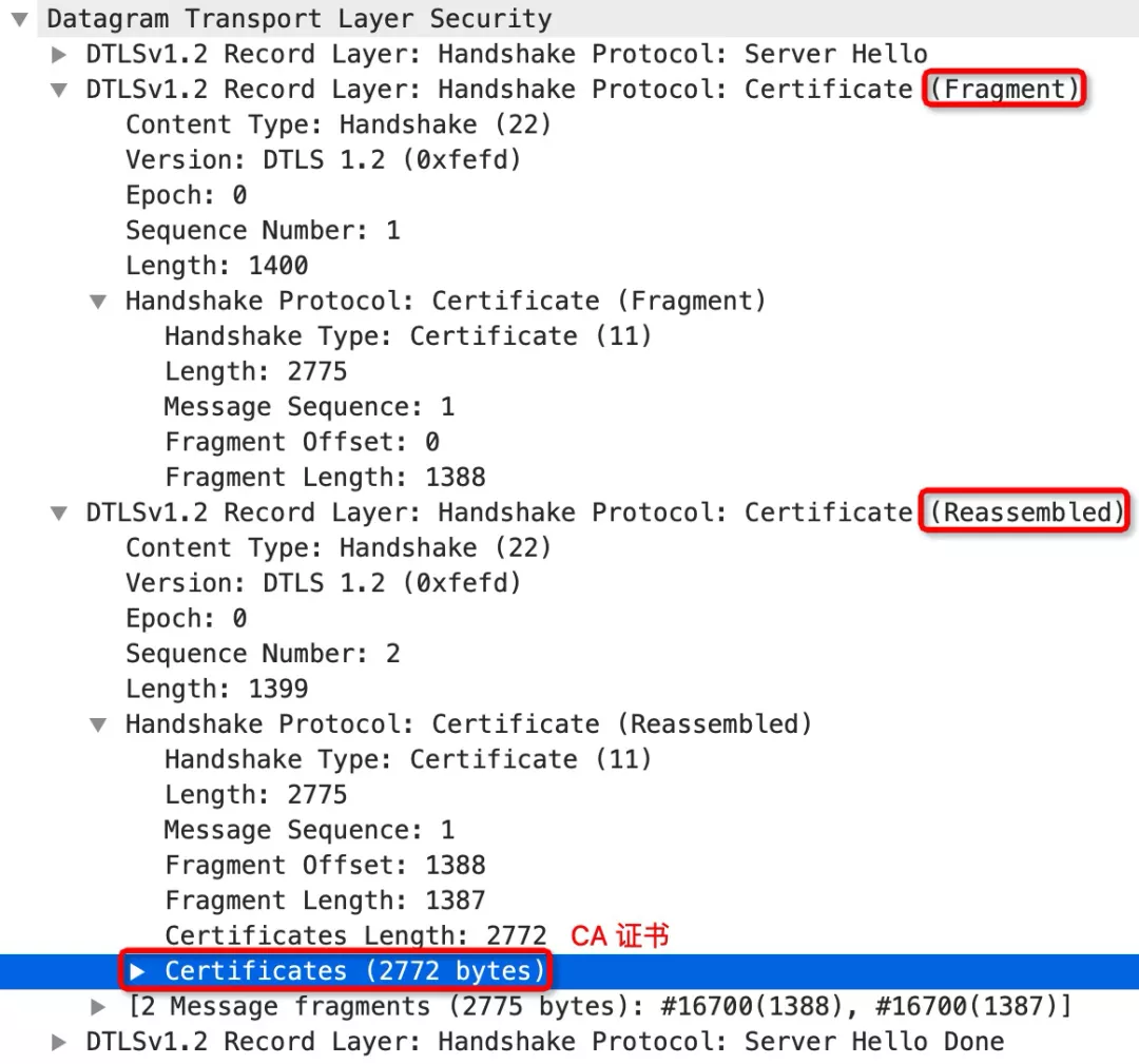 回过头来再看下导读中证书消息分片的这张图,两个 Record 的 message sequence 字段值相同,说明这是同一个 DTLS Message 的两个 Fragment。且每个 Record 都有 fragment offset 和 fragment length 这两个字段,用来标识分片的边界。所以,我们可以根据这两个字段去解析出每一个独立的 Fragment。