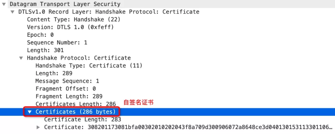 大家都知道, WebRTC 的 DTLS 使用的是自签名的证书,这个证书一般不会太大,如下图所示,只有 286 字节。