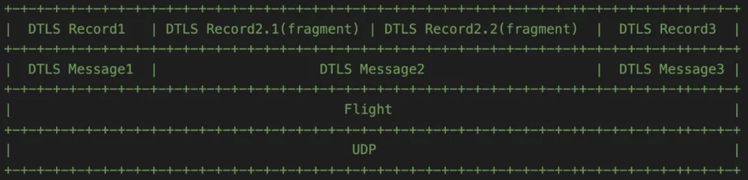 如果 Message 很小,未超过 MTU 的限制,那么一个 Record 足以装下一条 Message;如果 Message 很大,超过 MTU 的限制,那么就需要多个 Record 来装这条 Message。即这条 DTLS Message 会被分割为多个 Fragment,然后分别装入多个 Record。
