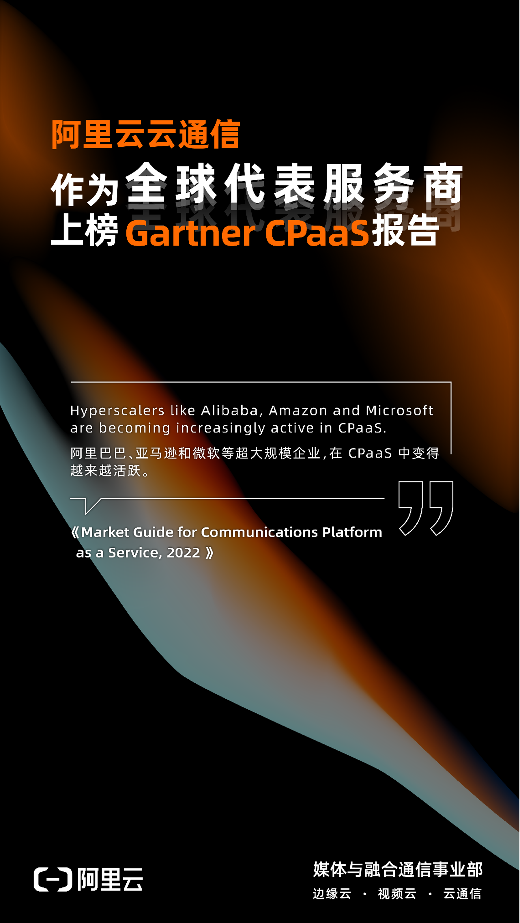近日,国际知名研究机构Gartner发布2022年《CPaaS市场指南(Market Guide for Communications Platform as a Service, 2022)》研究报告,阿里巴巴作为CPaaS全球代表服务商,上榜该报告。