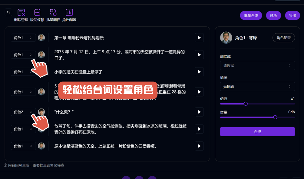 目前市面上的很多翻译配音工具都存在一个问题,那就是翻译配音时会直接翻译完整个视频的内容再配音,如果是好物带货类倒是不碍事,但是做短剧的朋友用起来就很不方便了,因为短剧中经常有男女多个角色的对话,如果翻译配音不分角色,剪辑完的效果会很差。