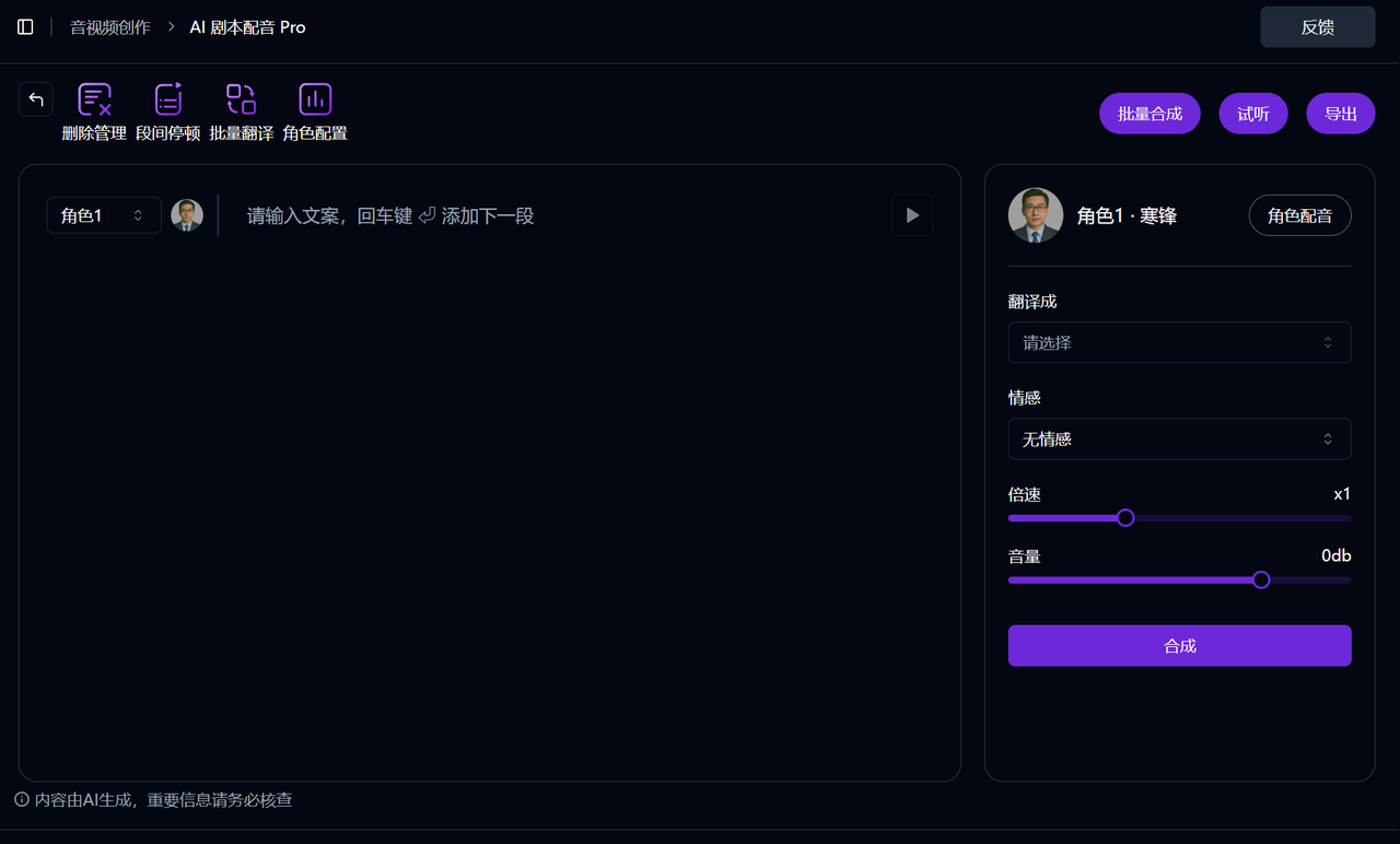 选择AI剧本配音pro功能→创建空白项目→手动进行剧本内容编辑