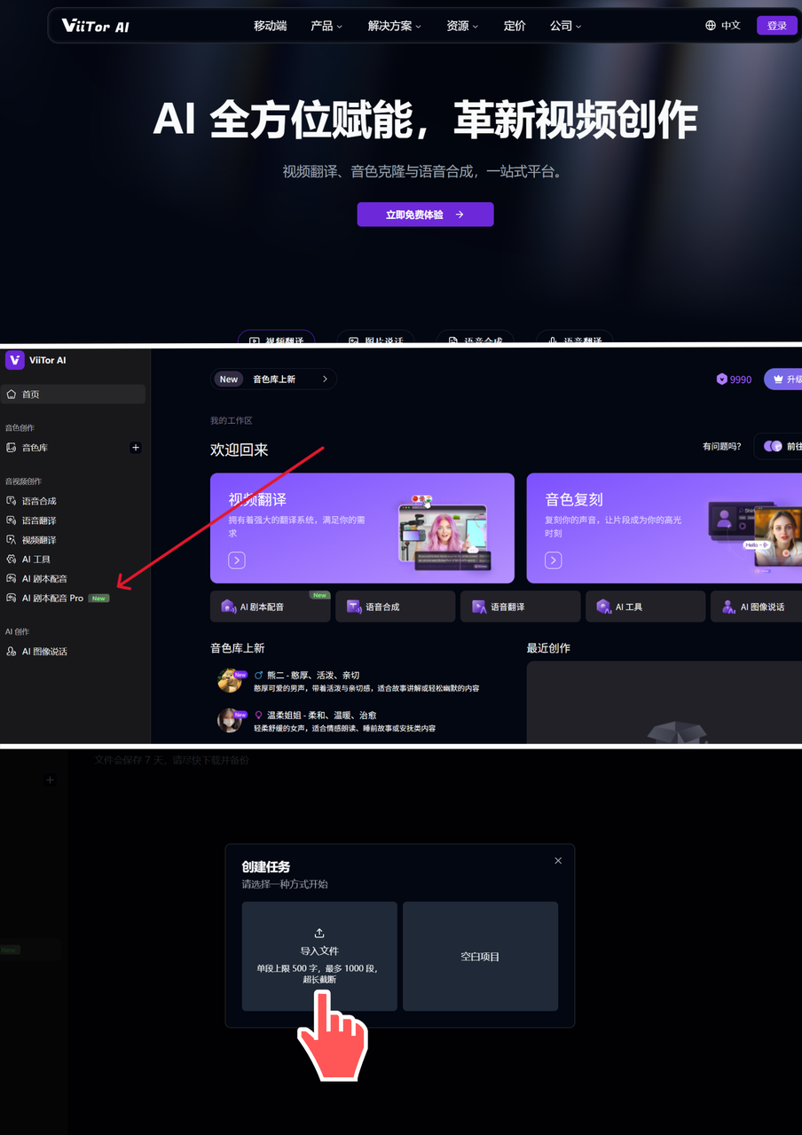 选择AI剧本配音pro功能→点击导入TXT文件→剧本内容编辑
