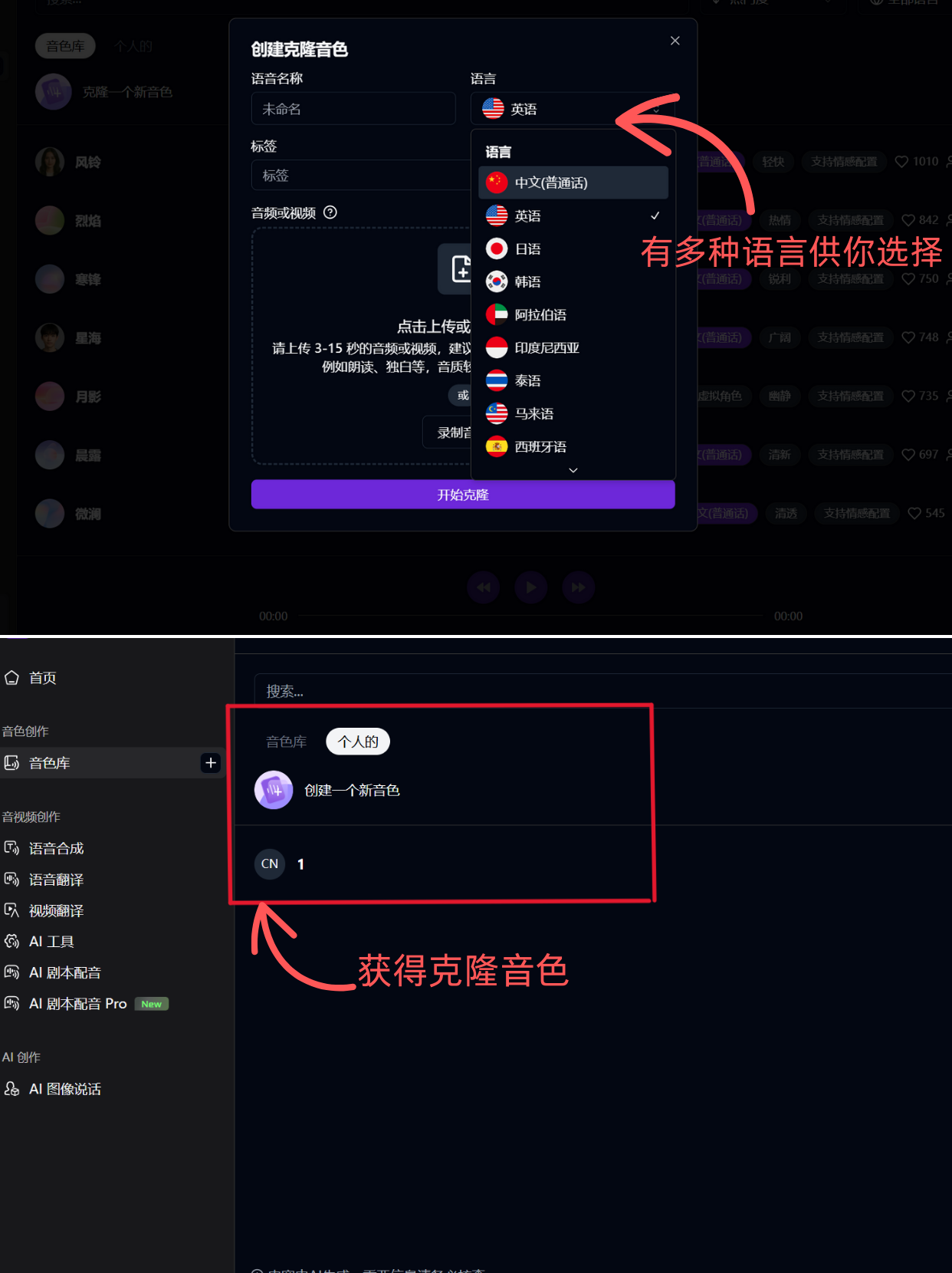 2. 选择所需语言并导入音频 → 开始克隆(19种语言可供选择)