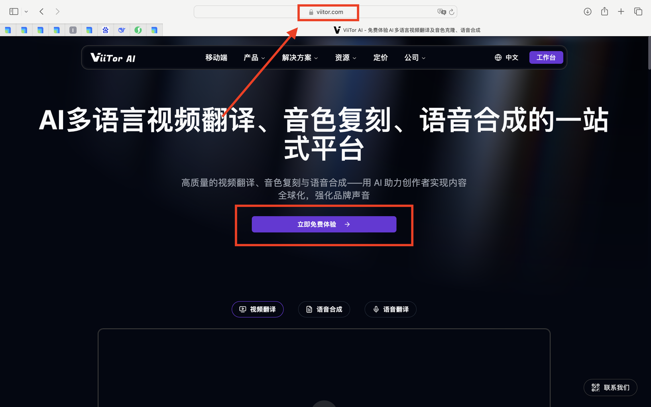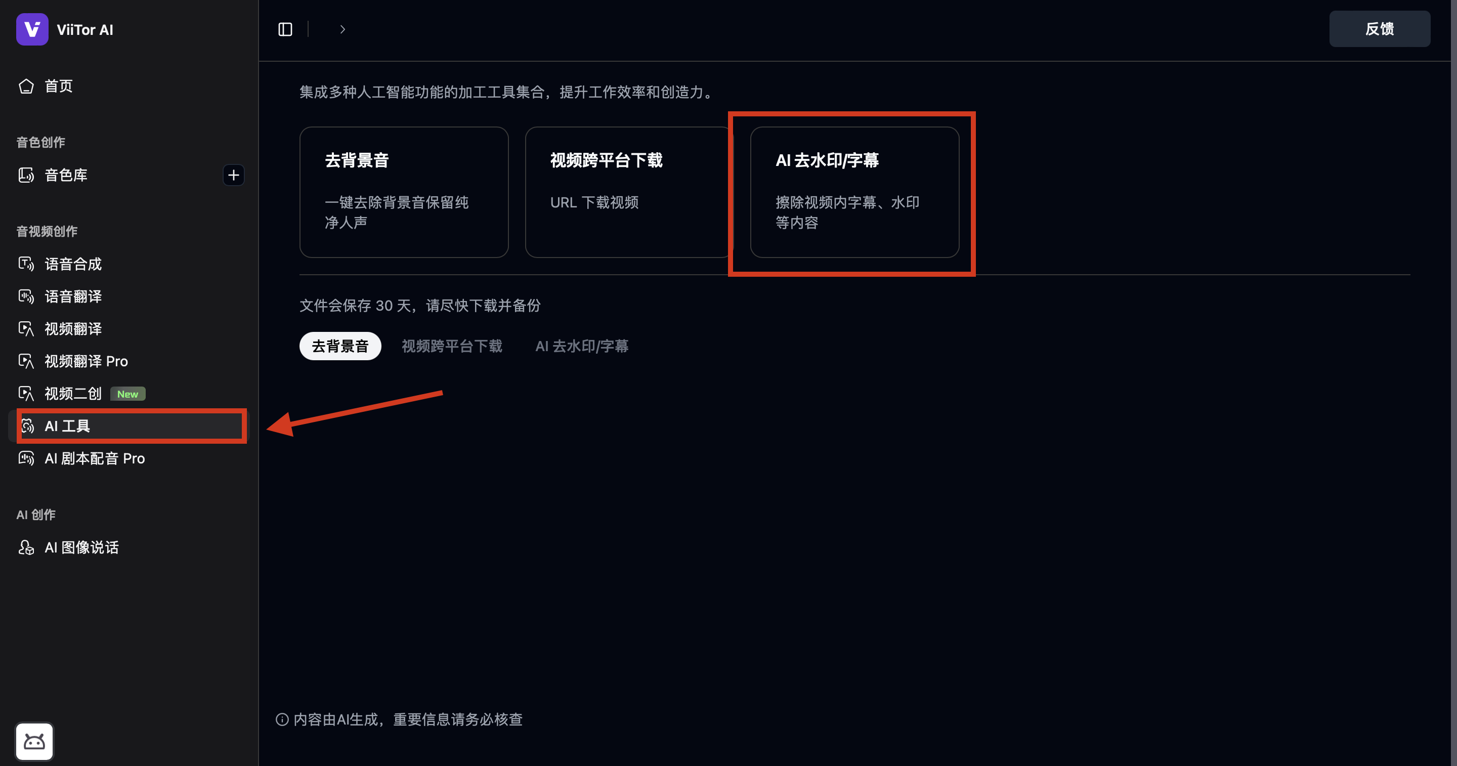 登录并选择功能 - 访问ViiTor AI工作台,登录后选择"视频去水印"工具