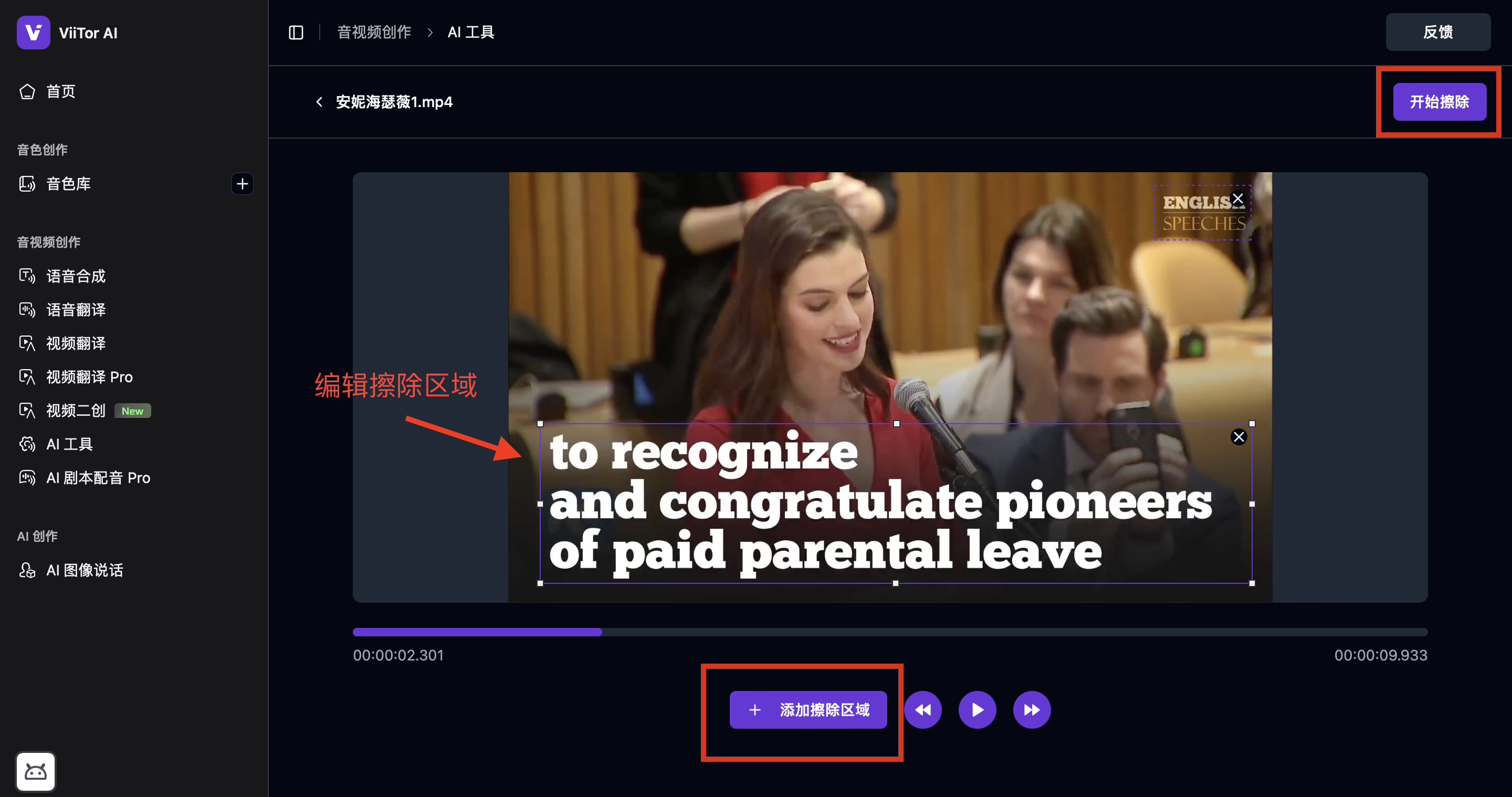 3. 一键处理 - 确认编辑区域后,点击开始按钮,AI将自动完成去除过程