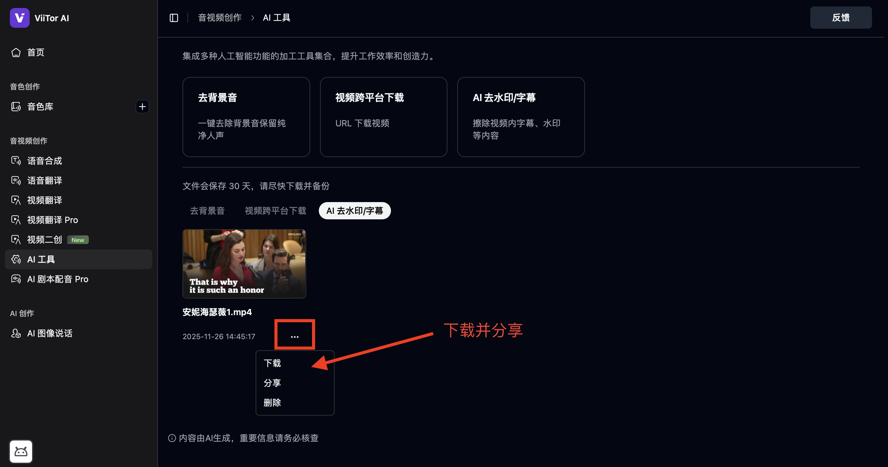 AI驱动的水印去除技术正在革新用户处理视频的方式。ViiTor AI的操作流程如下: