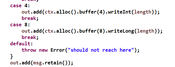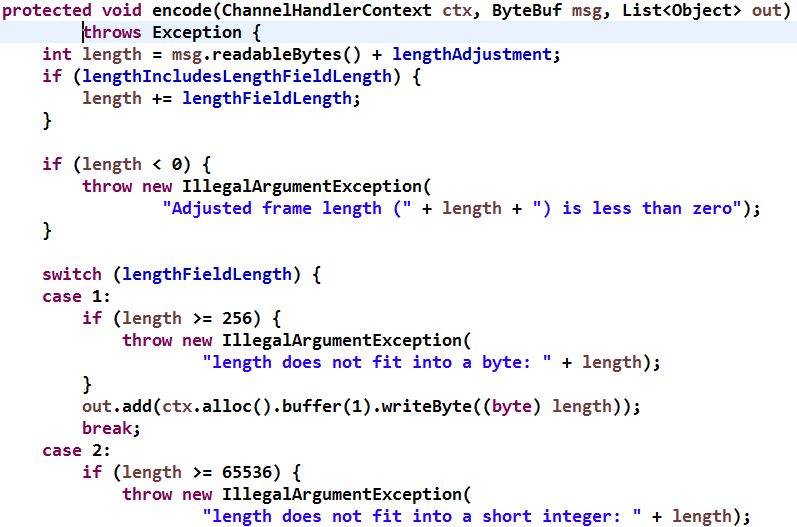 2) 长度字段所占字节为 2:如果使用 2 个 Byte 字节代表消息长度,则最大长度需要小于 65536 个字节,对长度进行校验,如果校验失败,则抛出参数非法异常;若校验通过,则创建新的 ByteBuf 并通过 writeShort 将长度值写入到 ByteBuf 中;
