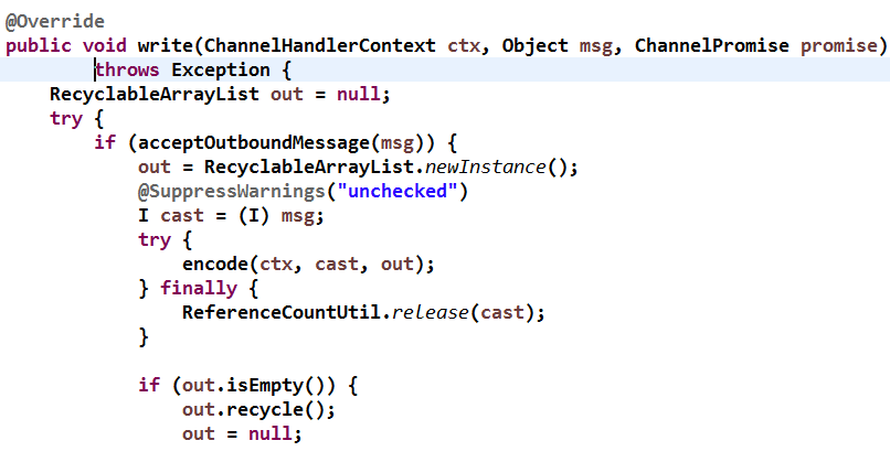 简单看下它的源码实现:创建 RecyclableArrayList 对象,判断当前需要编码的对象是否是编码器可处理的类型,如果不是,则忽略,执行下一个 ChannelHandler 的 write 方法。