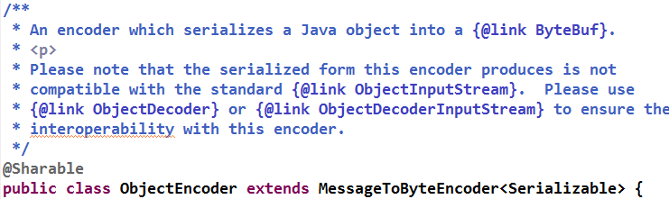 ObjectEncoder 是 Java 序列化编码器,它负责将实现 Serializable 接口的对象序列化为 byte [],然后写入到 ByteBuf 中用于消息的跨网络传输。