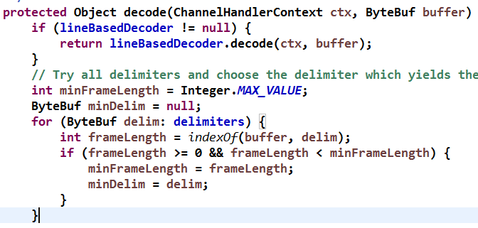 DelimiterBasedFrameDecoder 原理分析:解码时,判断当前已经读取的 ByteBuf 中是否包含分隔符 ByteBuf,如果包含,则截取对应的 ByteBuf 返回,源码如下: