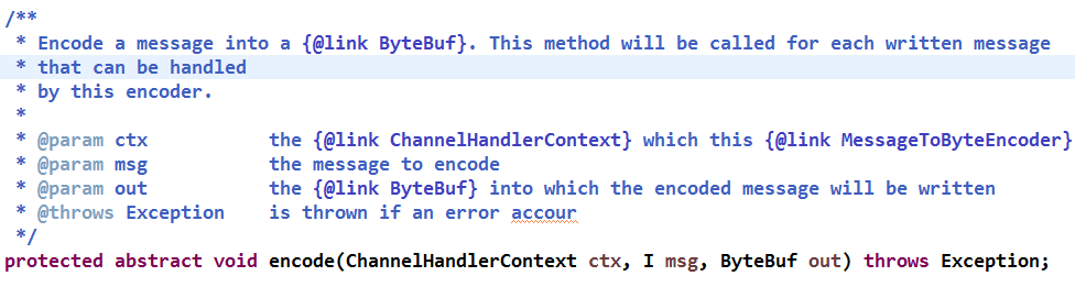 编码使用的缓冲区分配完成之后,调用 encode 抽象方法进行编码,方法定义如下:它由子类负责具体实现。