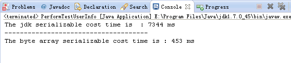 3) 序列化效率差:在相同的硬件条件下、对同一个 POJO 对象做 100W 次序列化,二进制编码和 Java 原生序列化的性能对比测试如下图所示:Java 原生序列化的耗时是二进制编码的 16.2 倍,效率非常差。