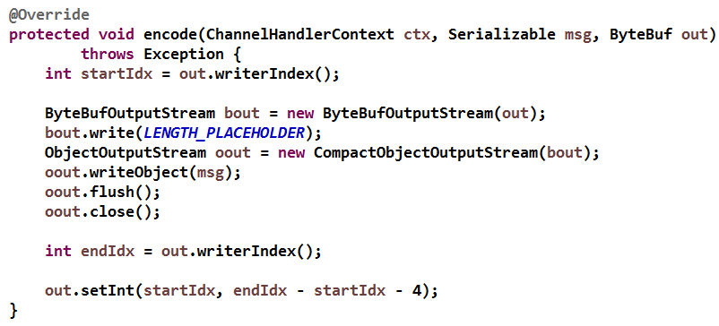 依次写入长度占位符(4 字节)、序列化之后的 Object 对象,之后根据 ByteBuf 的 writeIndex 计算序列化之后的码流长度,最后调用 ByteBuf 的 setInt(int index, int value) 更新长度占位符为实际的码流长度。
