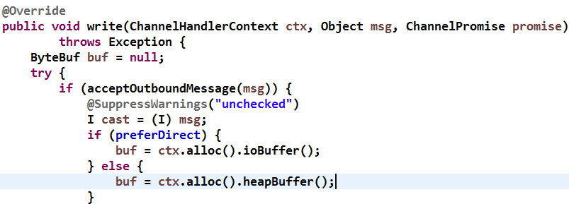 它的实现原理如下:调用 write 操作时,首先判断当前编码器是否支持需要发送的消息,如果不支持则直接透传;如果支持则判断缓冲区的类型,对于直接内存分配 ioBuffer(堆外内存),对于堆内存通过 heapBuffer 方法分配,源码如下: