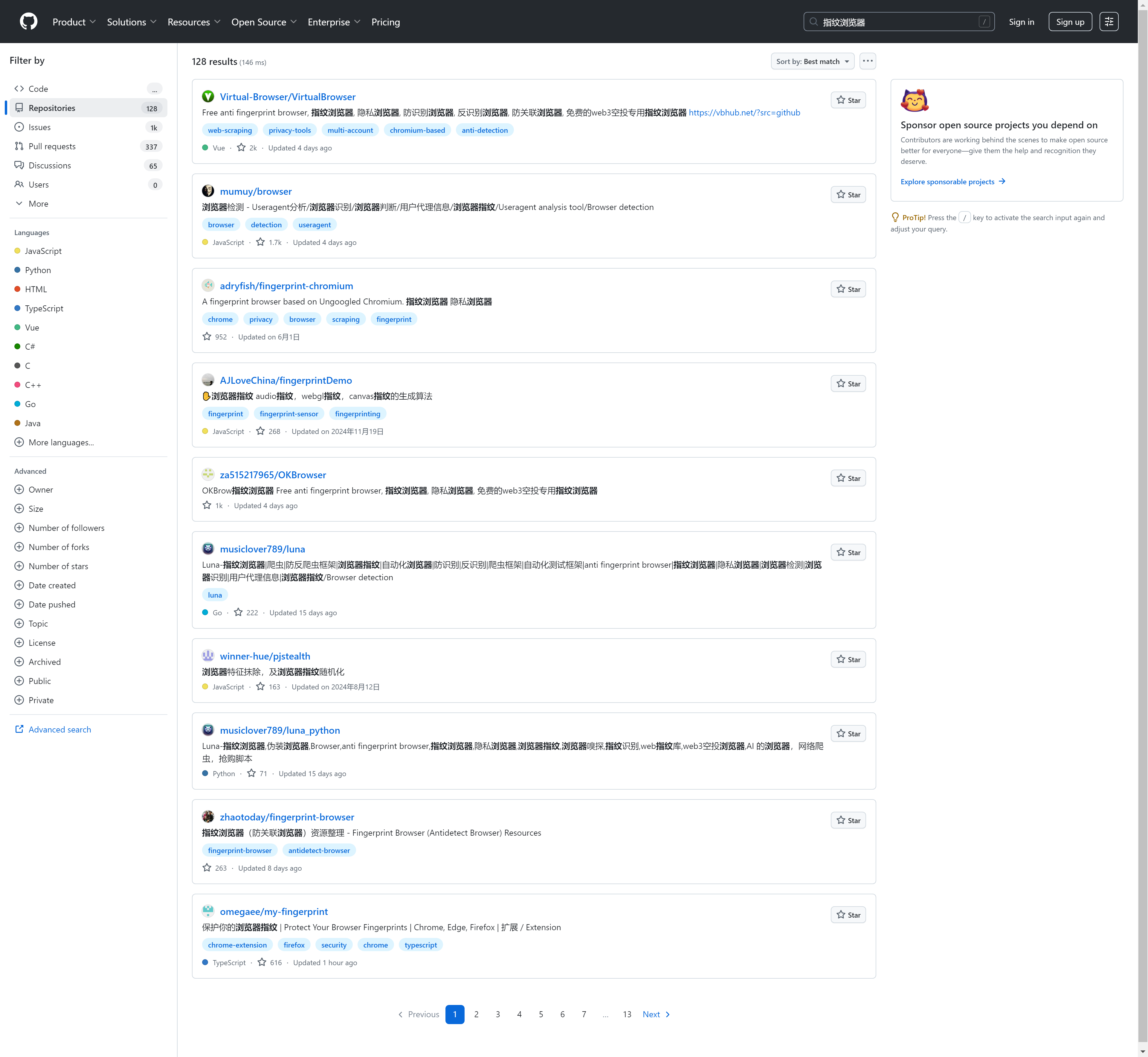 目前github搜索指纹浏览器项目排名如下,后续我将按照排名介绍每个指纹浏览器开源项目。