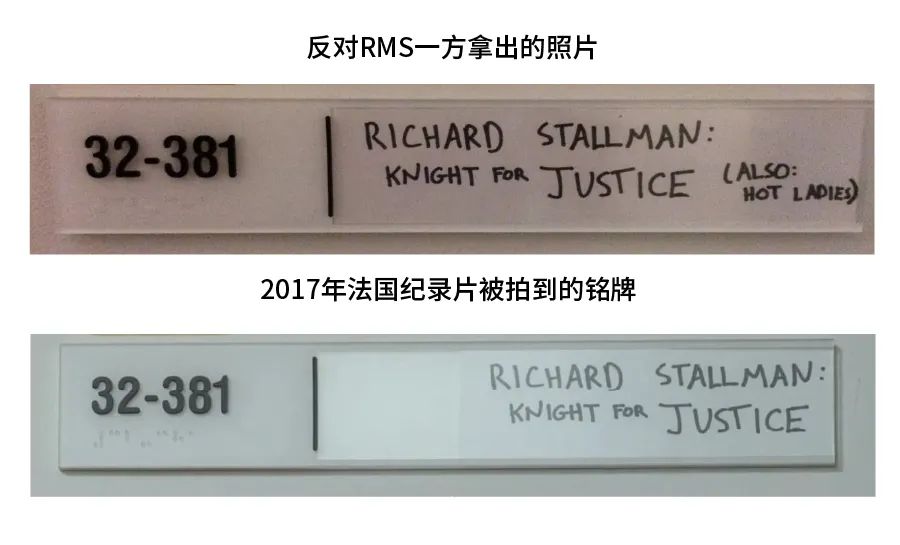 支持RMS的人试图寻找这件事的证据,最后在一部法国纪录片《互联网和共享革命》中找到了证据,导演在2017年采访RMS的时候,恰好拍摄到了他的办公室铭牌,其中可以清晰看到,铭牌尾部的”hot ladies“字样已经被剪掉了。