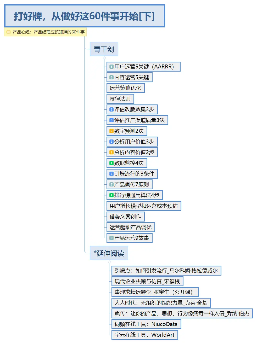 《产品心经:产品经理应该知道的60件事(第2版)_闫荣》第1篇内容讲述了PM心法“七剑”决的前3剑——舍神剑:PM核心素养(第1-6条),日月剑:认知产品(第7-10条),游龙剑:产品战略和规划(第11-22条);第2篇讲述了中3剑——天瀑剑:精益、灵活(第23-26条),莫问剑:智能+内涵,应对百变玄机(第27-35条),竞星剑:极简设计(第36-43条)