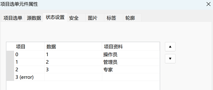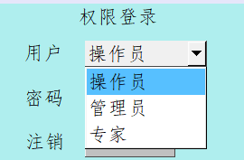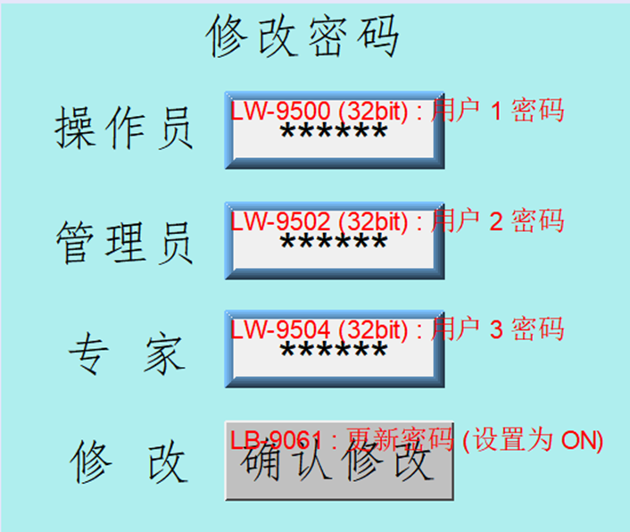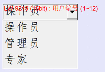 1、分别添加“用户1”、“用户2”、“用户3”密码输入框,分别对应“操作员”、“管理员”、“专家”用户权限。“用户1”、“用户2”、“用户3”读写地址分别为LW-9500、LW9502、LW9504。