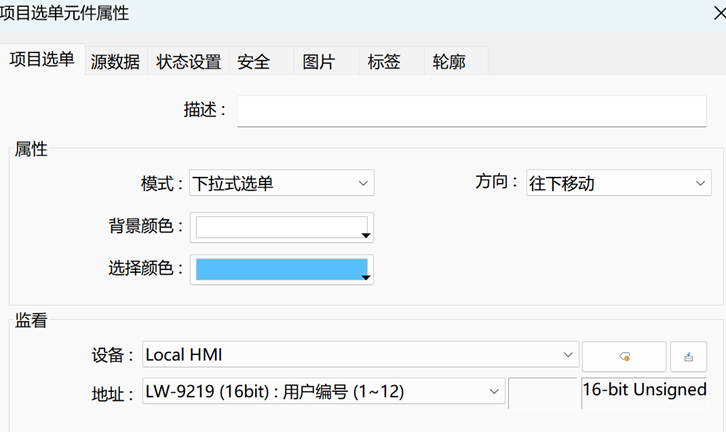 用户选择可制作下拉框,方便选择用户。监看地址设为LW-9219,项目数设3。
