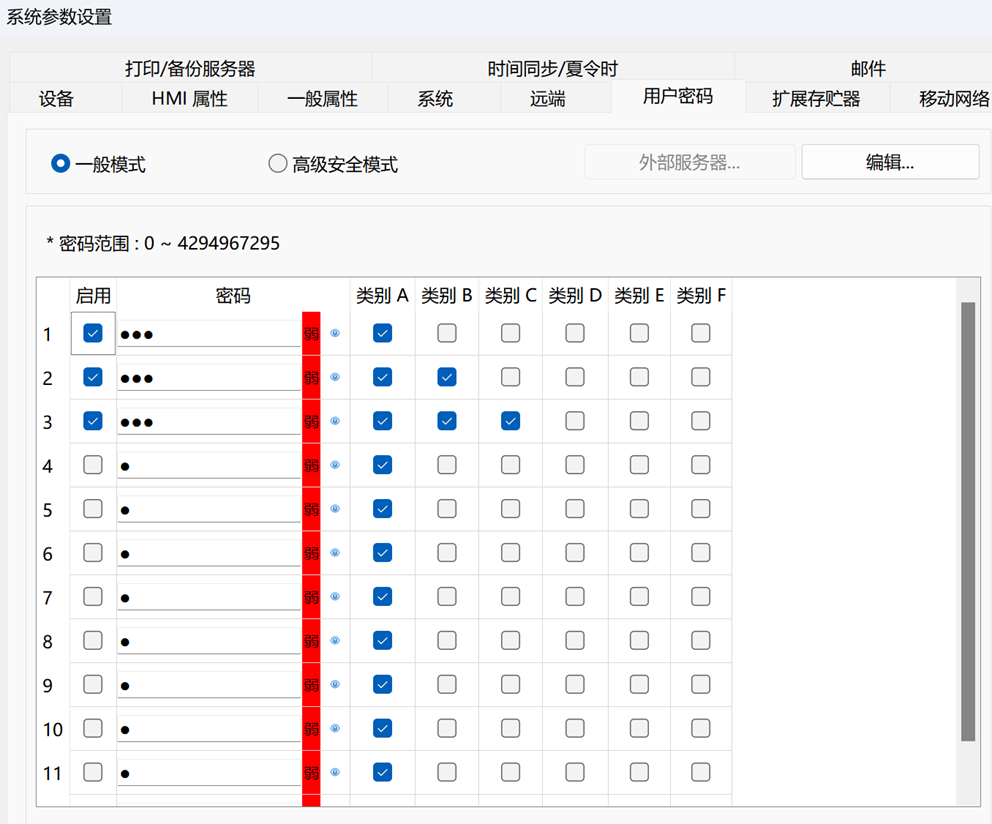 模式设置为“一般模式”,用户、密码以及权限类别根据实际需要设置。如下图为设置的参考案例。