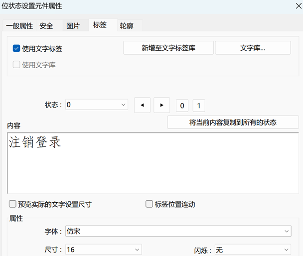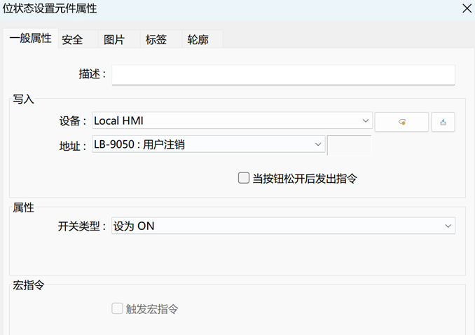 添加注销登录按钮。添加位状态设置元件,写入地址为LB-9050,开关类型选择“设为ON”。