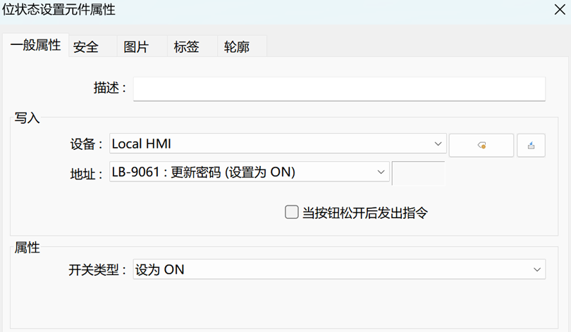 2、添加“更新密码”按钮,写入地址为LB-9061,开关类型选择“设为ON”;输入新密码后,当按下“更新密码”按钮时,密码即更新。