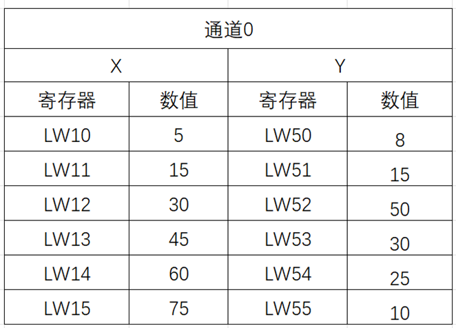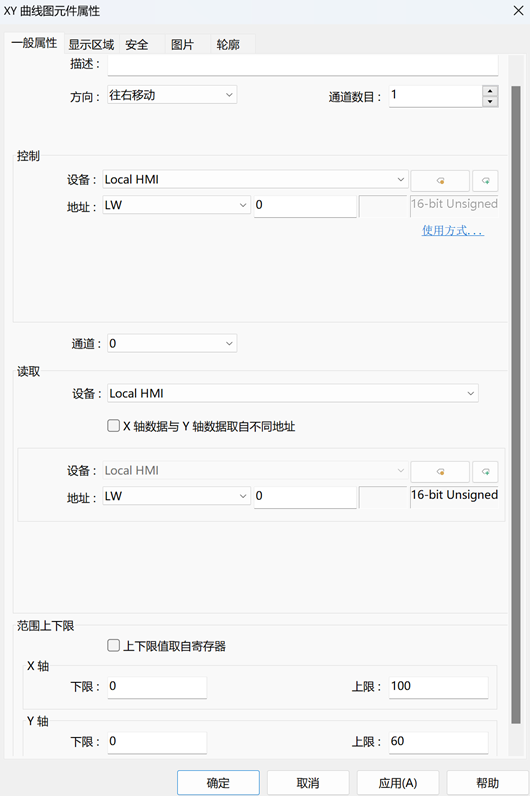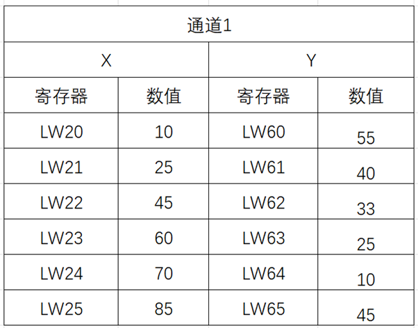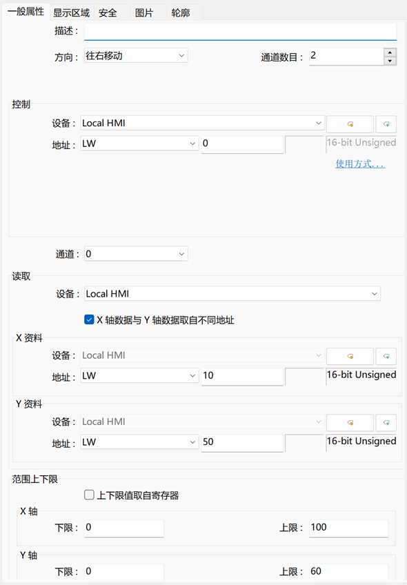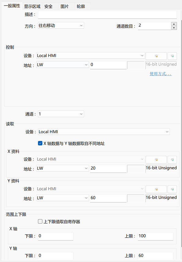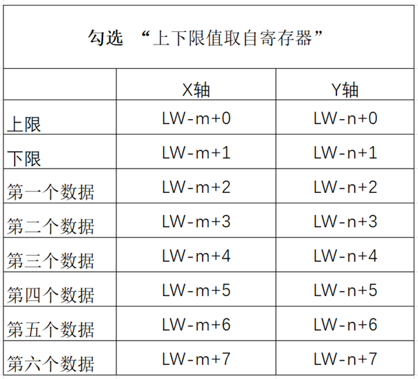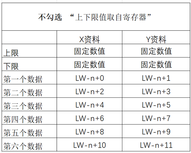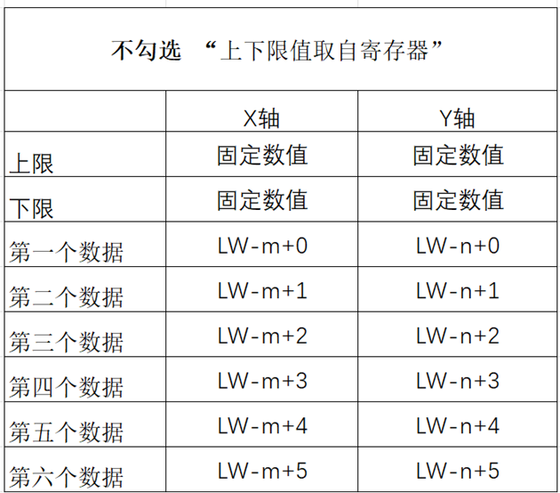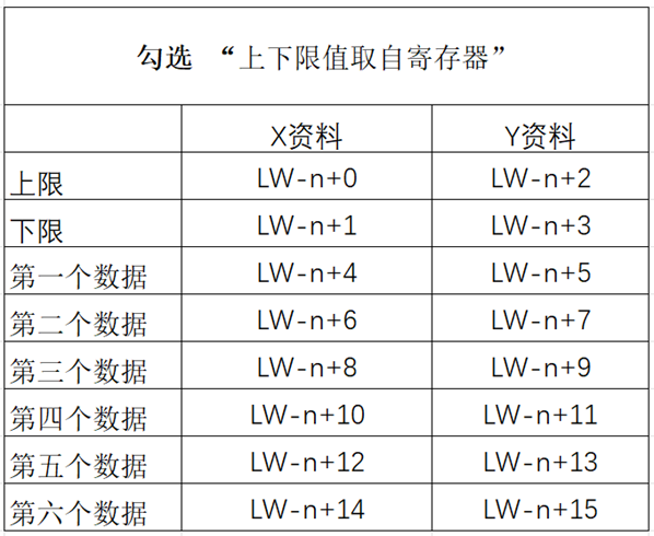 5:读取/范围上下限:“X轴数据与Y轴数据取自不同地址”和“上下限值取自寄存器”这两个选项勾选与否,将影响到数据资料的地址分配。详细见下表。