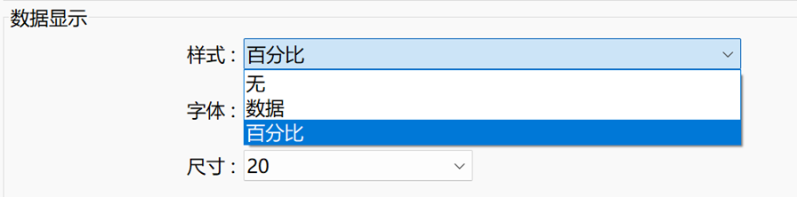 6、数据显示:设置圆饼图数据显示的样式,样式包含“无”、“数据”、“百分比”。“无”表示不显示数据;“数据”表示只显示数据;“百分比”表示显示的数据格式为百分比格式。