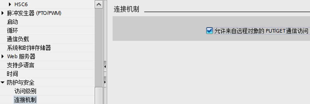 3、PLC设置,勾选“允许来自远程对象的PUT/GET通讯访问”;