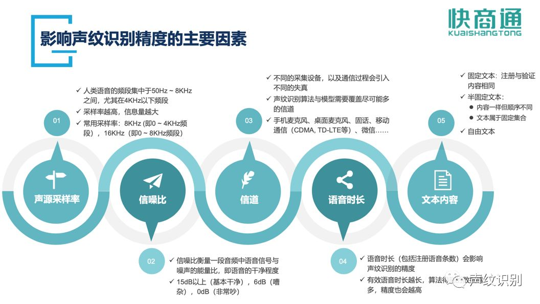 根据测算结果,公安部发布《GA/T 1179-2014安防声纹确认应用算法技术要求和测试方法》标准,声纹科技产品依据该标准进行数据采集。目前,用户如果按照事先指定的文本读出内容,声纹识别准确率已达99.8%;如不照读事先指定的文本内容而随意发声,声纹识别准确率也能达到99.1%。“虽然准确率不低,但还是存在误判的可能,在设计使用场景和流程时,需要考虑到声纹识别并非100%准确率的现实。”快商通声纹专家说,声纹作为金融产品的认证,需要看具体场景。对于辅助核实身份、名单识别、防欺诈、声纹锁登录等场景使用是合适的;但在大额支付类的场景中,如果将声纹作为唯一的认证手段,就需要充分评估风险。