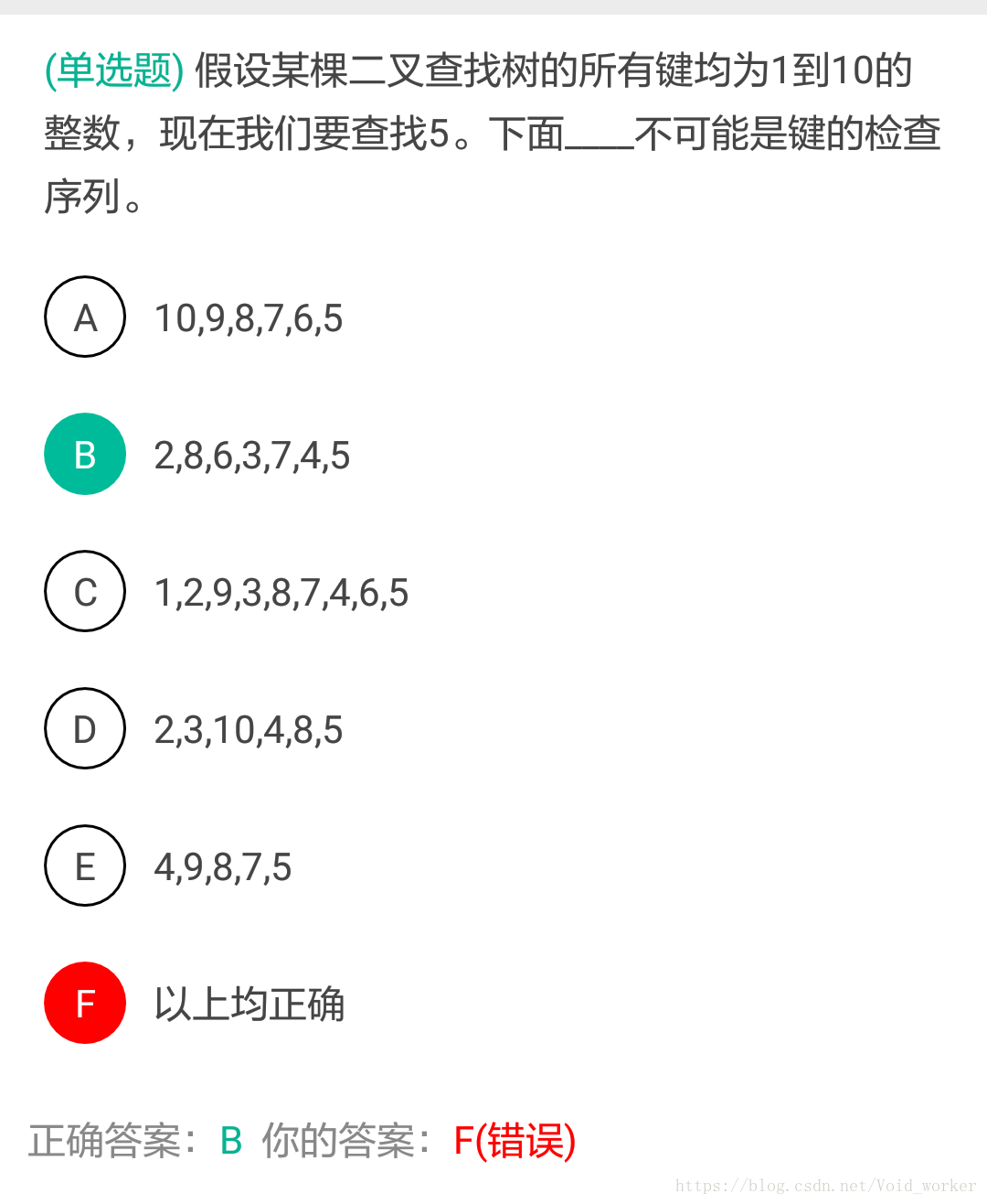 解析:利用二叉排序树的性质,对某结点,其左子树小于该结点,右子树大于该结点。那么,对任意一个元素,后面的元素要么全部大于它,要么全部小于它。B不符。
