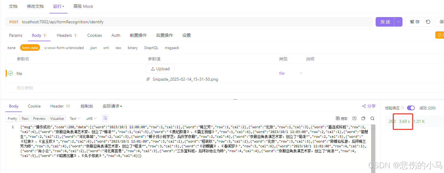 实际执行3秒多,因为ocr识别文字是非常耗时的,代码内部已经开了多个线程去跑,这个时间也可以接受,换张格子多数据少的图片再试下: