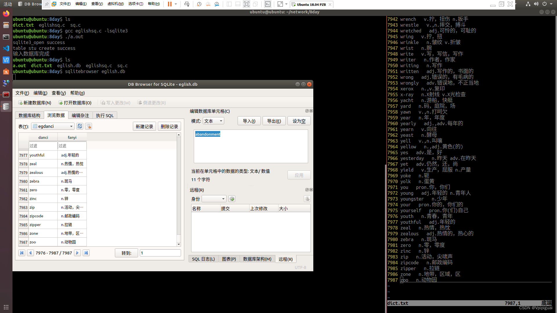 该程序打开并创建一个名为eglish.db的SQLite3数据库,建立一个表格sgdanci,然后从dict.txt文件读取四级单词及其翻译,将数据插入到表格中。当文件读取完毕,所有单词已存入数据库。